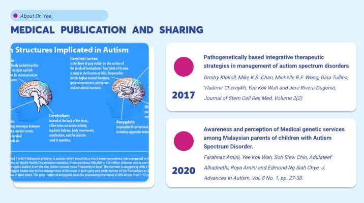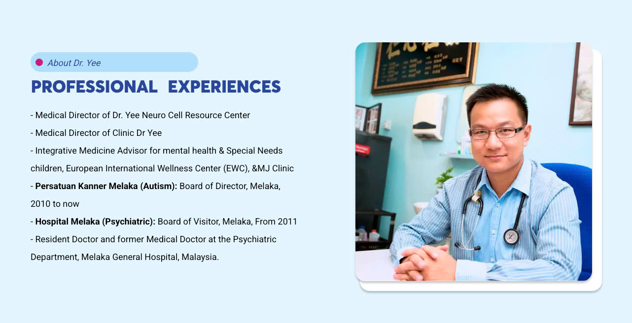 Datuk Dr. Yee Kok Wah, người sáng lập và giám đốc y tế của phòng khám, mang đến hơn 20 năm kinh nghiệm trong lĩnh vực y tế, đặc biệt là trong việc điều trị các rối loạn phát triển ở trẻ em. Ông đã theo học tại Học viện Y khoa về Nhu cầu Đặc biệt của Trẻ em (MAPS) tại Hoa Kỳ, dưới sự hướng dẫn của Dr. Dan Rossignol – một chuyên gia hàng đầu trong nghiên cứu và điều trị rối loạn phổ tự kỷ.