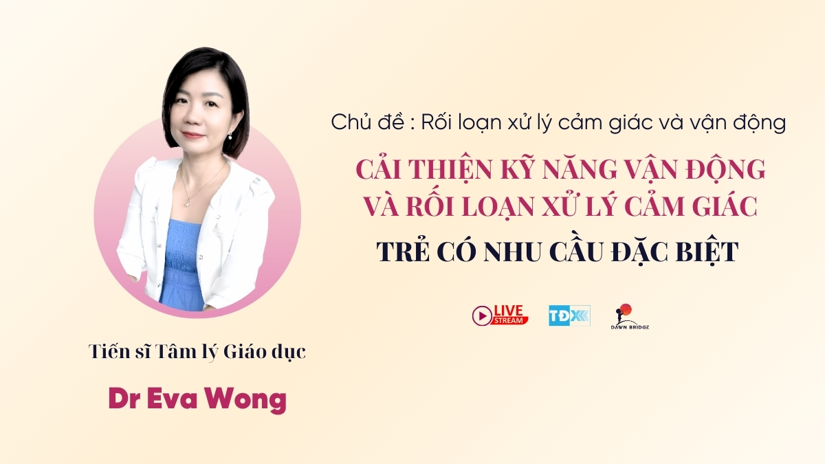 Con sợ hãi tiếng ồn, kén chọn thức ăn, khó khăn trong vận động? Đó là những dấu hiệu thường gặp của Rối loạn xử lý cảm giác và vận động ở trẻ đặc biệt. Thấu hiểu nỗi lòng cha mẹ, Dawn Bridge hợp tác cùng với Thắp Đèn Xanh hân hạnh tổ chức buổi livestream đặc biệt với chủ đề “Cải thiện tình trạng rối loạn xử lý cảm giác và vận động ở trẻ đặc biệt”, cùng chuyên gia đầu ngành – Tiến sĩ Giáo dục đặc biệt Eva Wong.