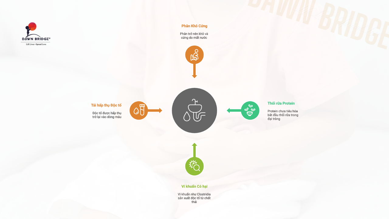 - Phân trở nên khô cứng (Vòng luẩn quẩn): Khi phân bị “kẹt” lại, Đại tràng vẫn làm nhiệm vụ của mình là… hút nước. Nó hút cạn kiệt nước từ khối phân, khiến khối phân càng ngày càng khô, cứng, và càng khó bị đẩy ra ngoài. Đây là vòng luẩn quẩn cơ học.