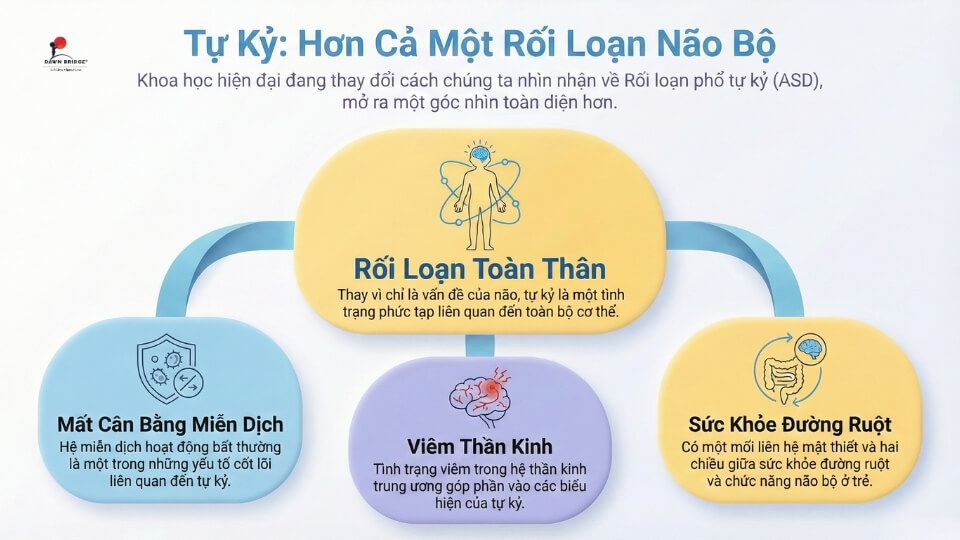 Tự kỷ không chỉ là câu chuyện của riêng não bộ mà là sự tương tác phức tạp giữa gen, môi trường, hệ miễn dịch và hệ tiêu hóa. Việc nhìn nhận tự kỷ như một rối loạn có tính chất toàn thân mở ra hy vọng mới trong việc hỗ trợ trẻ thông qua can thiệp y sinh và dinh dưỡng.