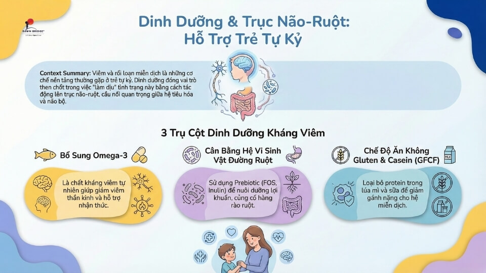 Dựa trên cơ chế viêm và rối loạn miễn dịch, dinh dưỡng đóng vai trò then chốt trong việc hỗ trợ trẻ tự kỷ. Các nghiên cứu, bao gồm bài tổng quan của Madore et al. (2016), nhấn mạnh vai trò của Axit béo đa không bão hòa (PUFAs), đặc biệt là Omega-3, và hệ vi sinh vật đường ruột.