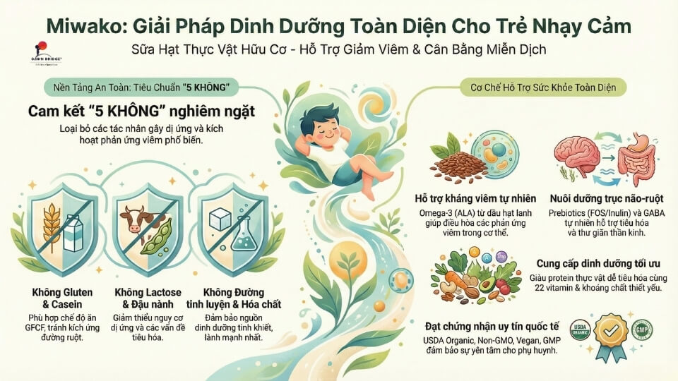 Hiểu được tính chất “toàn thân” của rối loạn phổ tự kỷ, việc lựa chọn nguồn dinh dưỡng an toàn, lành tính và có khả năng hỗ trợ giảm viêm là ưu tiên hàng đầu. Miwako và Miwako A+ là dòng sữa hạt thực vật hữu cơ được thiết kế chuyên biệt, đáp ứng các tiêu chuẩn khắt khe về dinh dưỡng cho trẻ nhạy cảm.